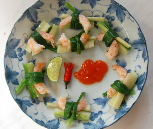 - Chỉ với nguyên liệu đơn giản gồm hành lá, tôm tươi, dưa leo, bạn đã có món tôm cuộn hành giòn dai lạ miệng.